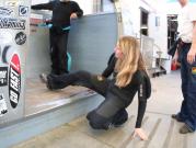 "Well there's yer problem!" |  Danilo concludes that the reason for Daria's cutaway was that the parachute failed to open |  Morgan prepares to whip Momentum into shape |